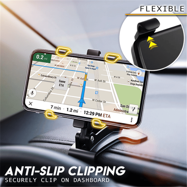 This phone holder features a strong, anti-slip clip to securely attach your device to the dashboard, sun visor, or even front mirror.