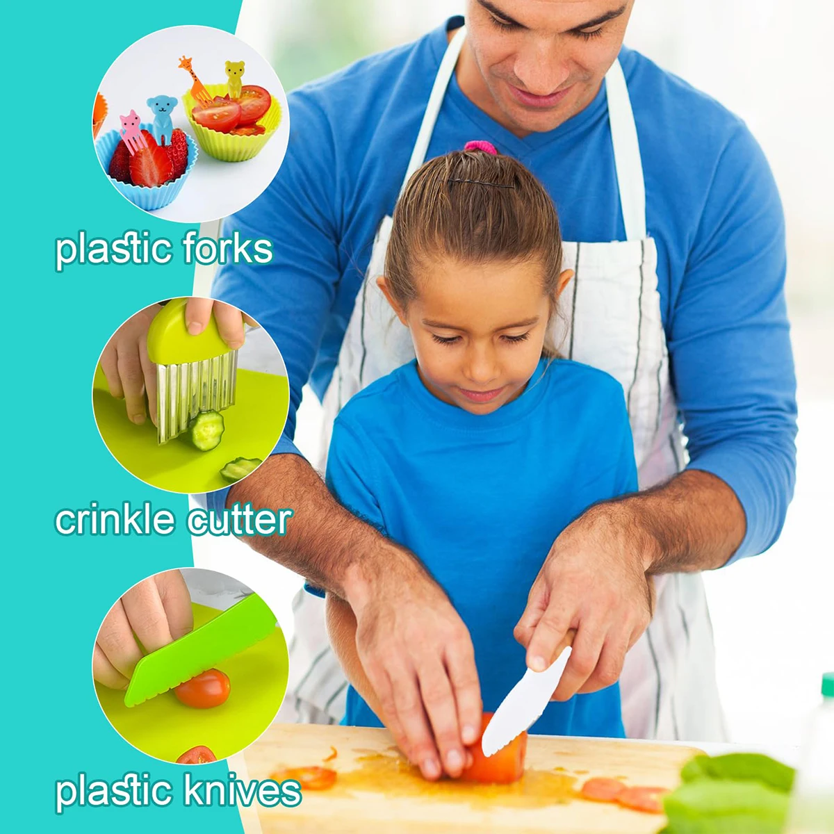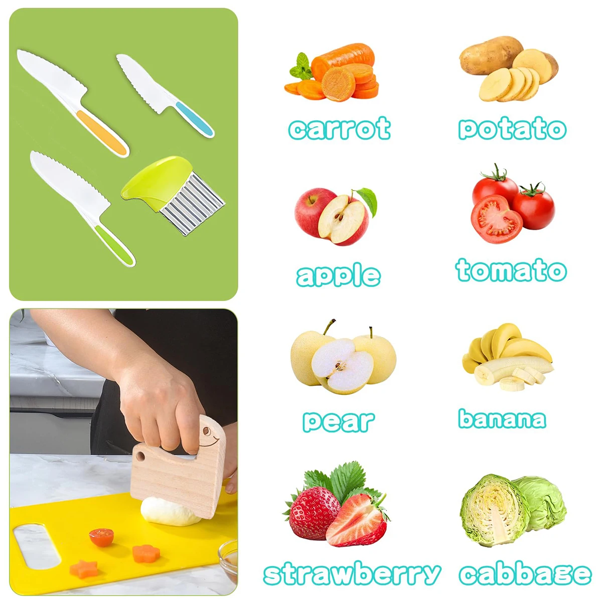 The kid-safe knives and utensils are designed to prevent accidents, allowing children to safely use the tools while practicing their cutting, mixing, and cooking skills.