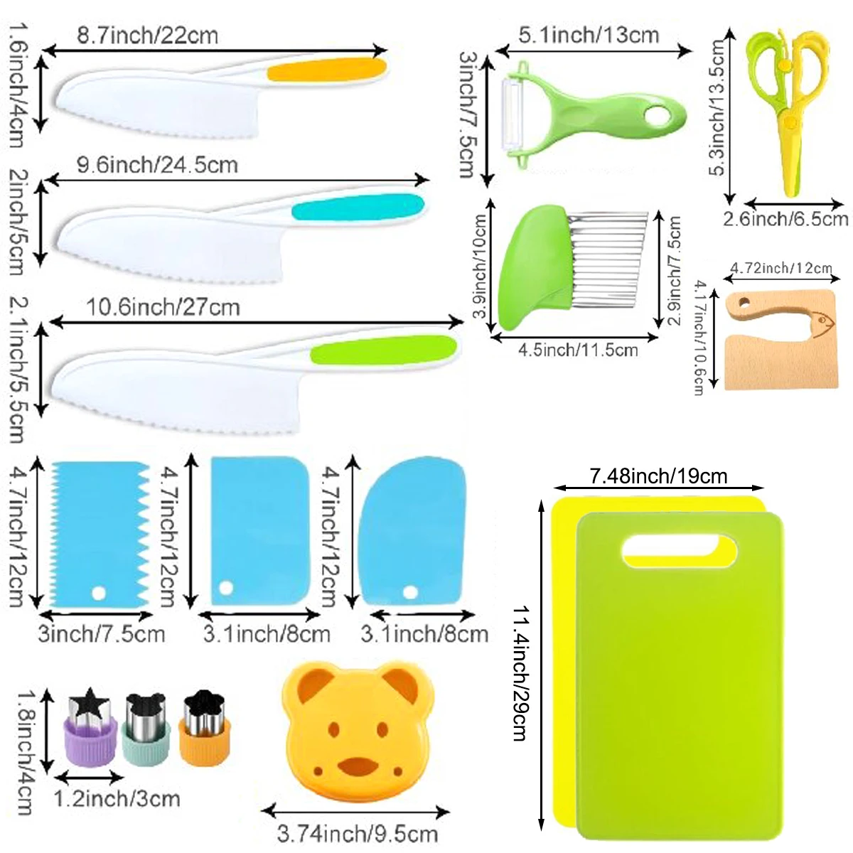 Package Contents [Toddler Cooking Set]: Children's kitchen knife set includes 1 wooden children's knife, 4 children's kitchen knives, 2 cutting boards, 1 Y-shaped paring knife, 4 fruit cutting shapes, 1 groove cutter, 3 cake cutters, 1 bread sandwich mold, 1 children's scissors. The various styles and uses of toddler cookware can meet the needs of children.