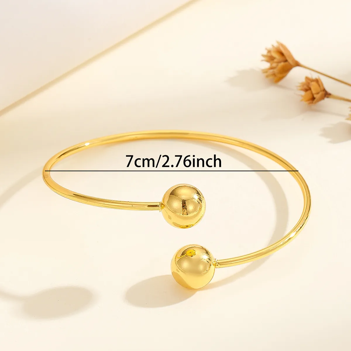 The bracelet is open and consists of two thin metal rods with round and full gold ball decorations at each end. It is simple yet exquisite,