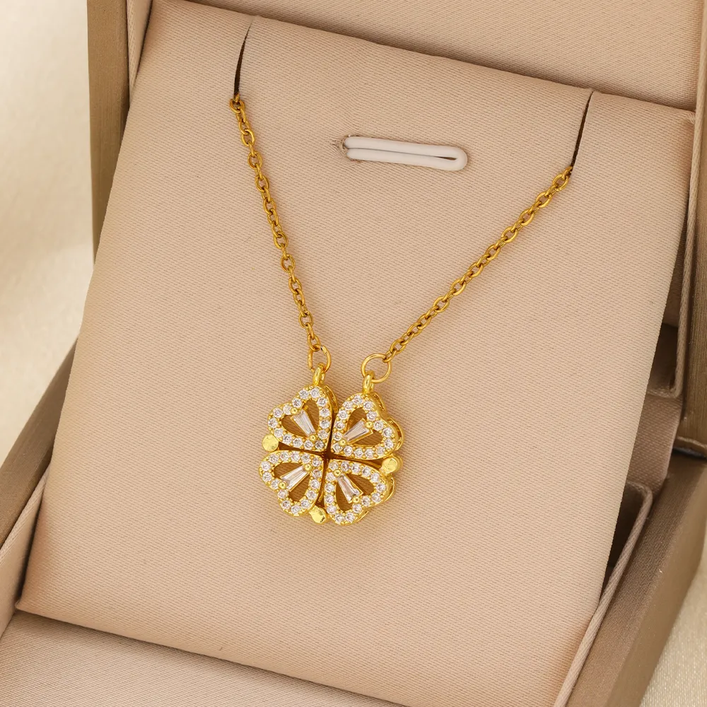 Fashionable Zircon Heart-shaped Necklace with Magnetic Folding Four Leaf Heart-shaped Connection - Perfect for Daily Wear and Dinner Parties