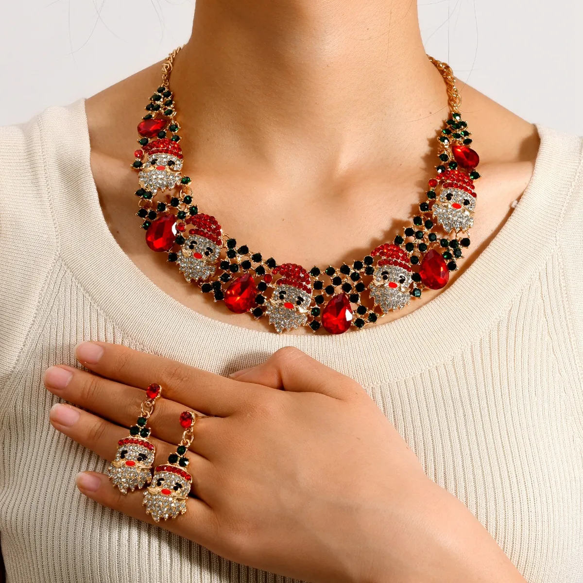 This necklace and earrings set brings Christmas cheer to any outfit with its vibrant Santa Claus design, decorated with colorful rhinestones that sparkle from every angle. The attention to detail in the Santa Claus pendant and earrings adds a playful yet sophisticated touch to your holiday style. Whether worn together or separately, this jewelry set makes a bold festive statement that complements any holiday attire, from cozy sweaters to elegant dresses.