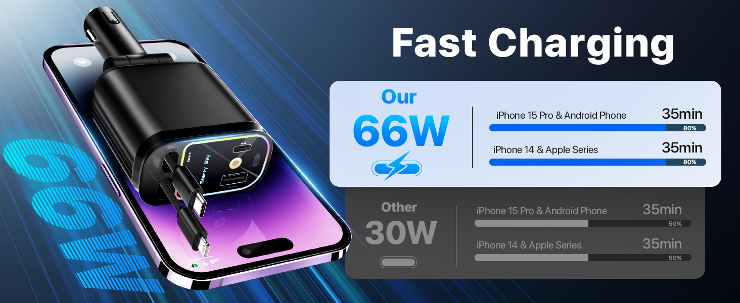 Universal Compatibility: The retractable car charger is designed for a wide range of mainstream vehicles and supports multiple fast charging