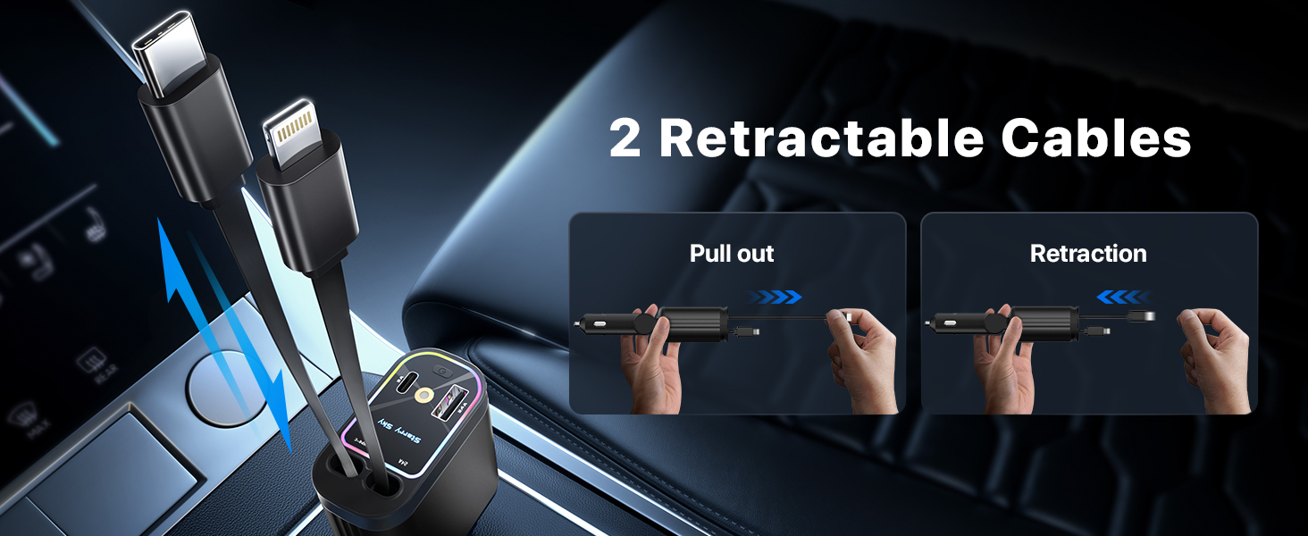 charger for neat storage. Simply pull out the cable when needed, and it retracts after use, keeping your car organized and free of tangled
