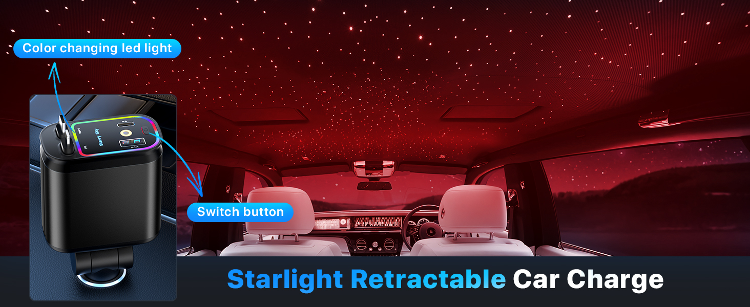 - 【Auto Rewind Retractable Car Charger】: This Star Lights car phone charger comes with retractable Type-C and ios charging cables, each stretching up to 80cm (31.5 inches). Stretching for a short distance and then release to automatically bounce back to its original position. This design ensures that your car remains clutter-free and that the cables do not get tangled, providing a smooth and convenient charging experience.