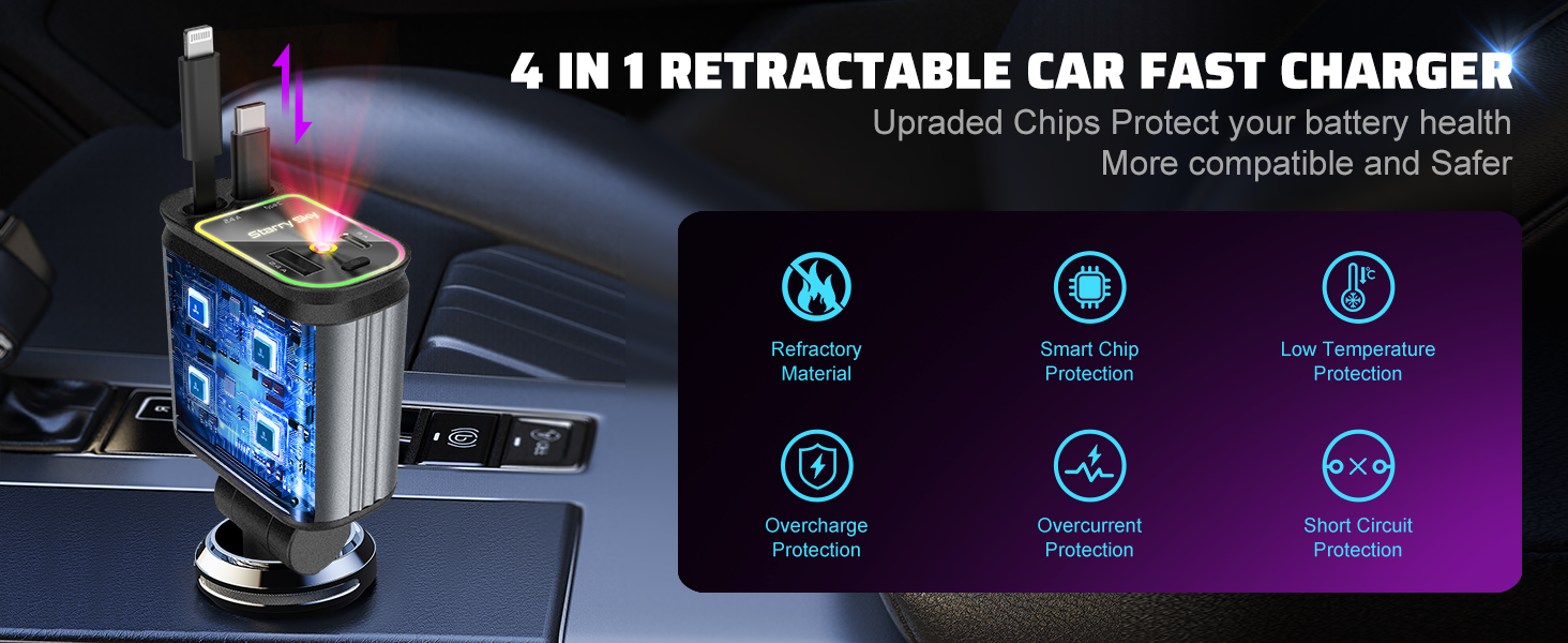 4-in-1 Charging Cords: This fast car charger adapter supports simultaneous fast charging for up to 4 devices. It includes 2 retractable