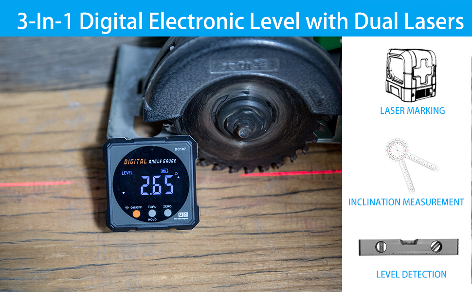 slopes, or other angled surfaces, the 4-Side Magnetic Digital Angle Gauge with Laser makes your work faster, more accurate,