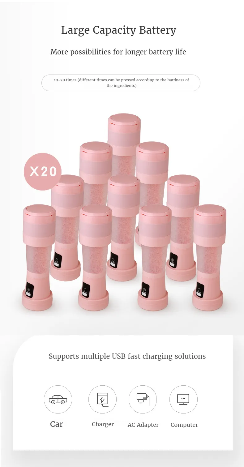 4. USB charging: it can be charged by USB, or by the power supply, car charger, mobile power supply. You can make various juices to meet