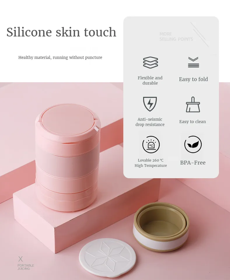 1. Organic silicon material: The juicer is made of food-grade organic silicon and ABS material, which is convenient to carry and clean. The