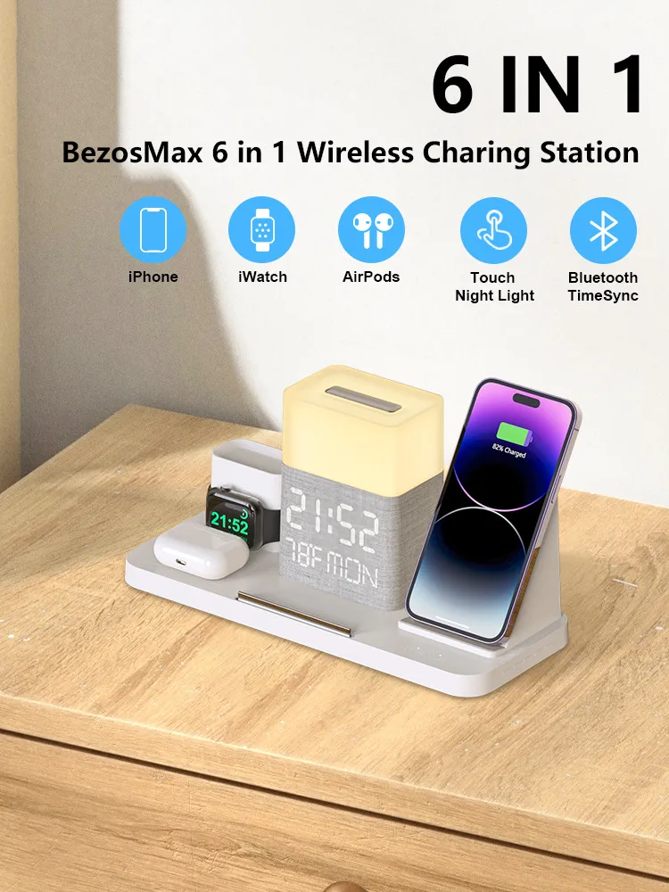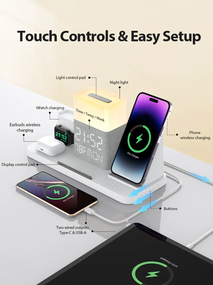 The 6-in-1 Wireless Charging Set with Touch Night Light is a versatile, all-in-one charging solution designed to simplify your tech setup while enhancing the ambiance of your space. This multifunctional device combines wireless charging, a touch-sensitive night light, Bluetooth synchronization, and a digital clock, providing everything you need for your mobile devices and more.