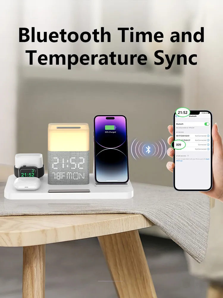 6-in-1 Functionality: Wireless charging pad for mobile phones, Bluetooth speaker synchronization, digital clock,
