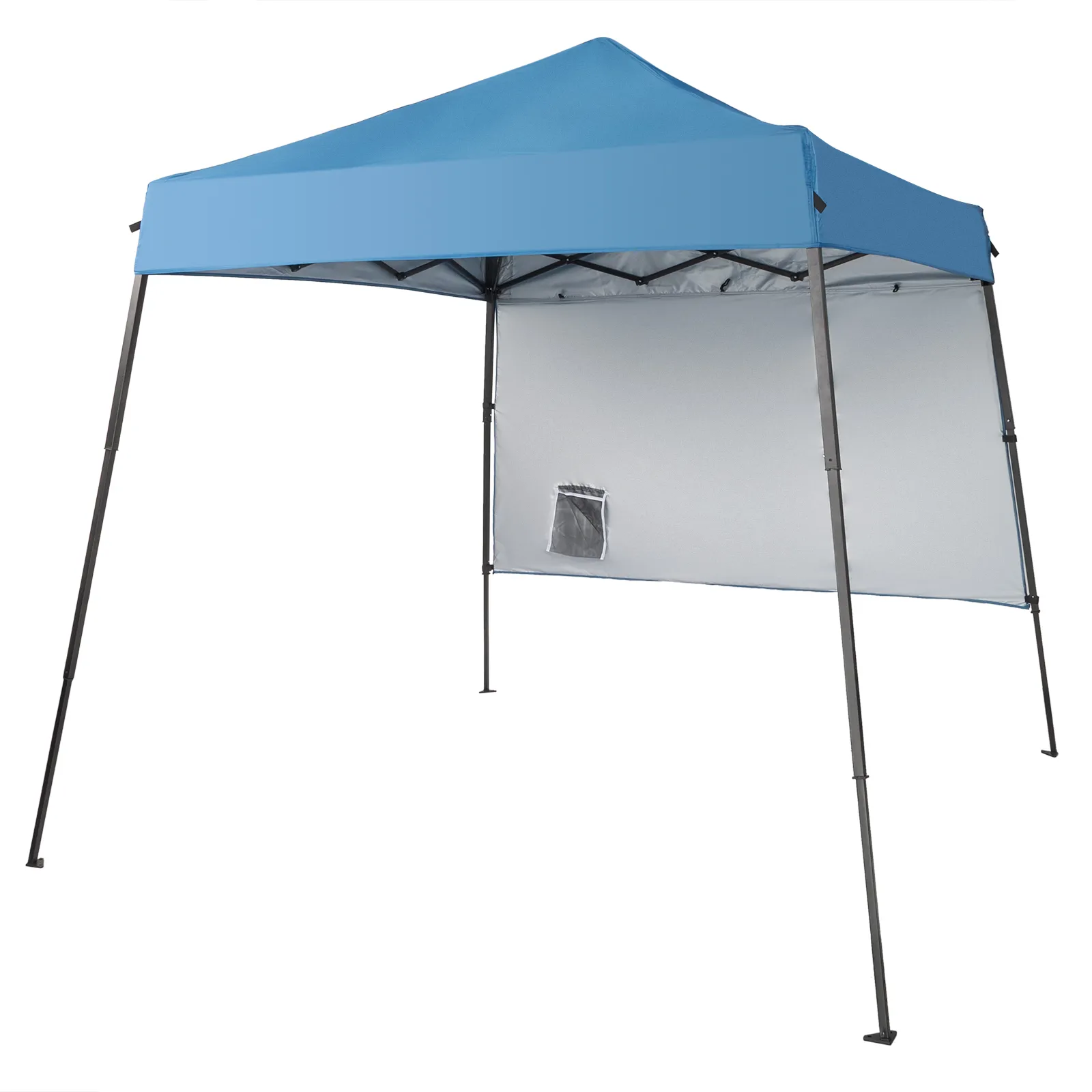 Design: Sky blue canopy with diagonal white stripes, complemented by a single side surrounded by cloth, providing partial