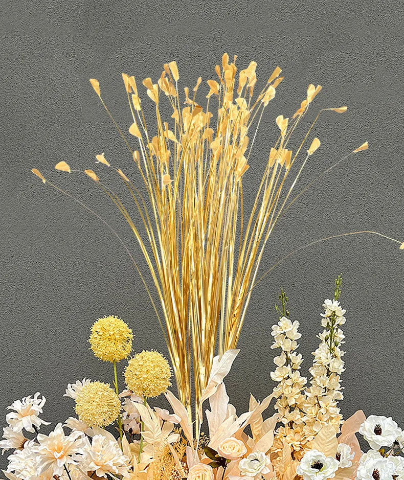 The artificial flowers are designed to look incredibly realistic, offering an eye-catching display that will impress guests and create a memorable atmosphere. The glitter accents add a touch of shimmer, while the reed leaves and onion grass offer a natural, organic feel to the arrangement.