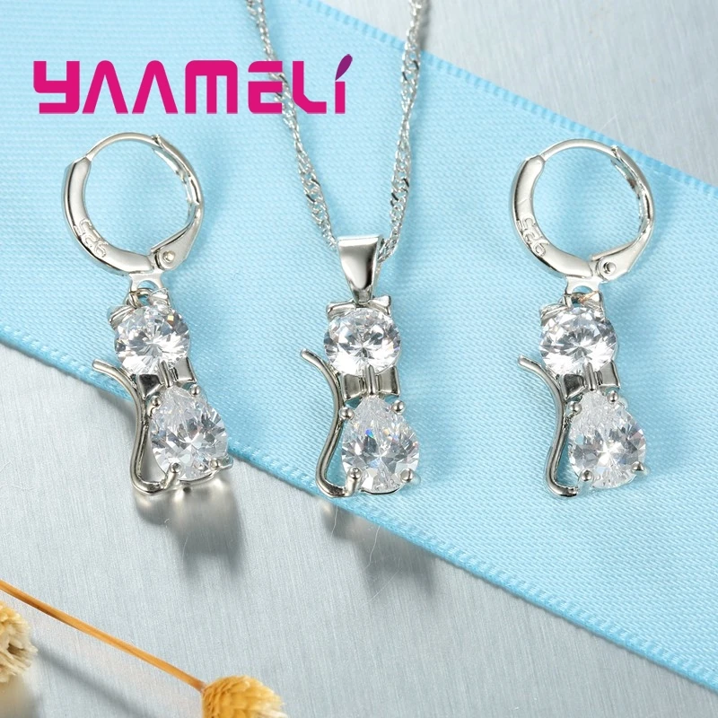 925 Sterling Silver Cat Jewelry Set Austrian Crystal Necklace & Huggie Earrings for Women & Girls