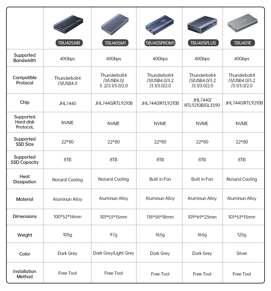 Package content: USB 4.0 ssd case/ 50CM thunderbolt 4 cable/thermol pad/user manual