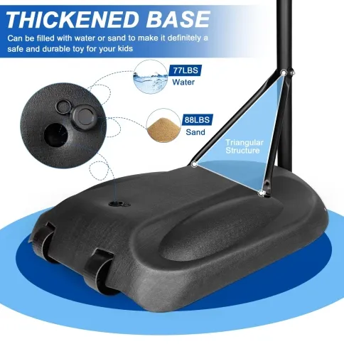 - DURABLE AND SOLID BASE:It is designed with a soild and sturdy basketball base.The basketball goal's triangular stable base(32\'*23\'*6.3\')can be filled with 77LBS water or 88LBS sand,ensuring a strong and study base in ant case.