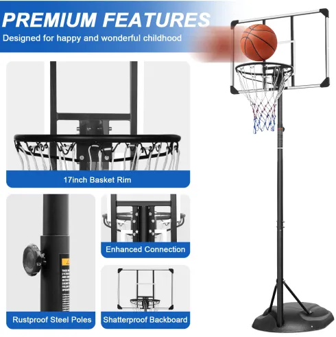 - 2022 UPGRADED DURABLE MATERIAL:It is designed with a sturdy steel pole for superior strength and a high-strength & wind-protected PVC transparent backboard, this basketball goal is impact-resistant and shatterproof enough for the most competitive games. Using high strength HDPE blow molding base and durable all-weather nylon net, this hoop will definitely last many basketball seasons.