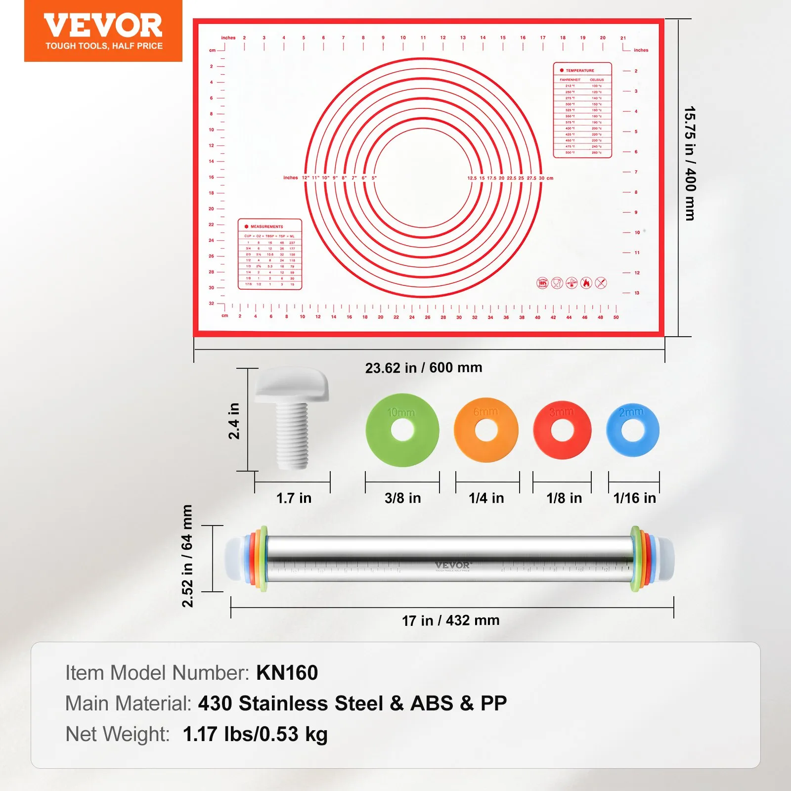 frequent use. The stainless steel rolling pin is rust-resistant, and the mat is designed for long-term durability.