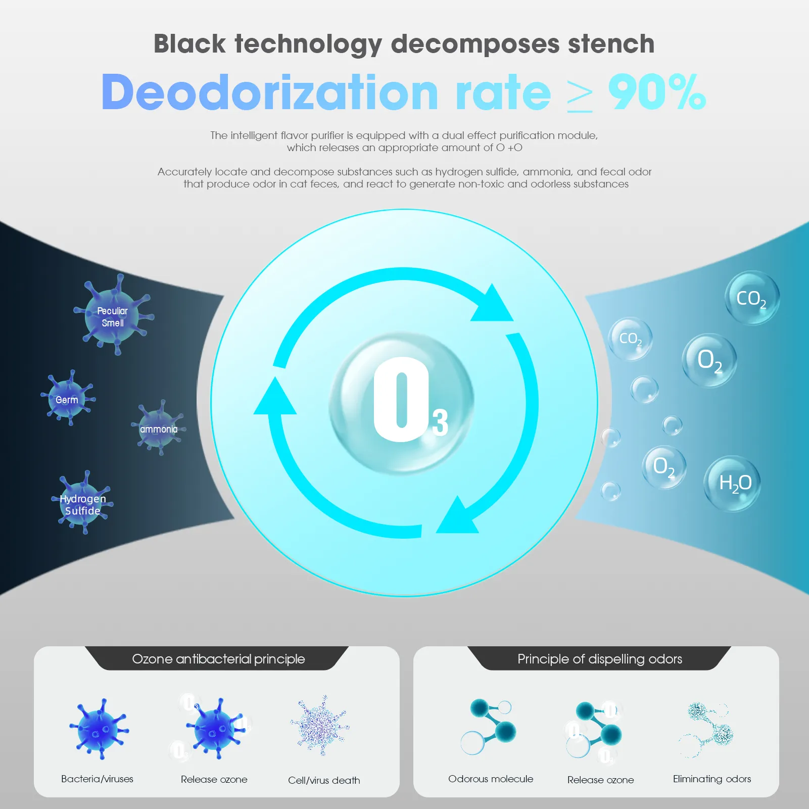 - Uses advanced filtration and sterilization technology to capture airborne particles and neutralize odors.