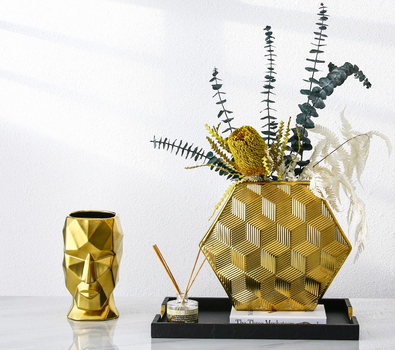 Add a touch of modern elegance to your space with the American Modern Golden Abstract Human Face Vase. This unique, artistically designed vase features an abstract human face sculpted with smooth, clean lines that exude sophistication and creativity. Crafted from high-quality, durable ceramic, this vase has been finished with a luxurious golden glaze that catches and reflects light, making it a captivating centerpiece in any room. Measuring [insert size], it's an ideal fit for coffee tables, shelves, office desks, or entryway consoles. Whether displayed on its own or filled with fresh flowers, dried grasses, or elegant pampas, this abstract face vase blends seamlessly with various décor styles— from contemporary and industrial to minimalist and eclectic. Perfect for art lovers and décor enthusiasts, this vase is more than just a vessel; it’s a statement piece that embodies the allure of modern American design with a touch of golden artistry. Use it to enhance your home, gift it to someone special, or simply add an eye-catching element to your office. Transform your space into a stylish, art-inspired environment with this standout decorative vase.