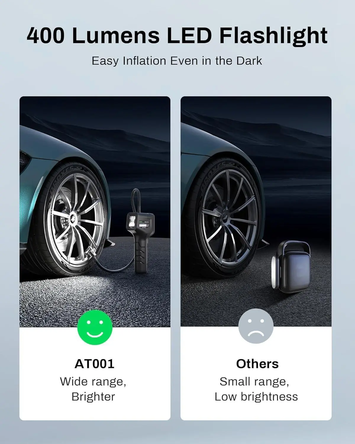 The AMPBANK AT001 is a must-have for anyone looking to maintain the correct tire pressure for better driving performance and safety. Its 150 PSI maximum capacity and automatic shut-off function make it reliable for a variety of vehicles, including cars, motorcycles, SUVs, and bicycles. The integrated tire pressure gauge helps ensure you’re inflating your tires to the ideal pressure, while the LED light adds an extra layer of convenience for nighttime use.