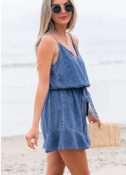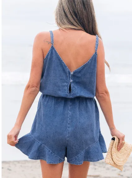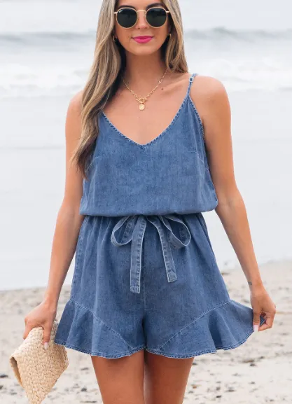 Ashleigh Blue Spaghetti Straps V Neck Belted Ruffled Leg Chambray Romper