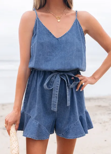Ashleigh Blue Spaghetti Straps V Neck Belted Ruffled Leg Chambray Romper