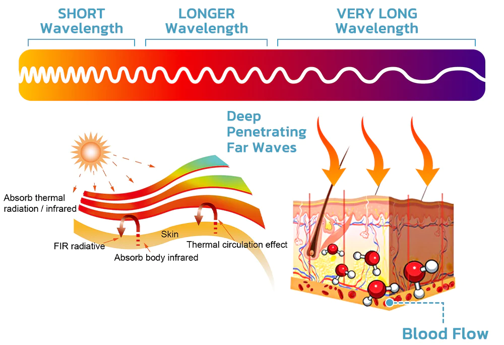 the use of far infrared radiation, it improves blood circulation, metabolism, collagen production and breaks down subcutaneous fat, helping