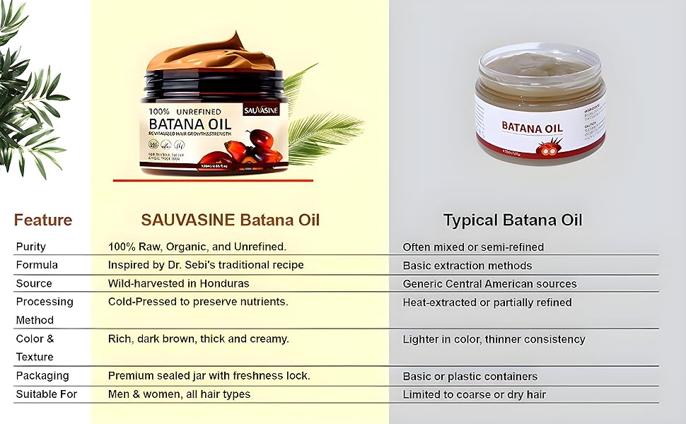 - Natural and Safe: 100% unrefined Batana Oil, we offer a natural, chemical-free hair care solution. Suitable for all hair types, it delivers safe and wholesome care without additives or harsh chemicals