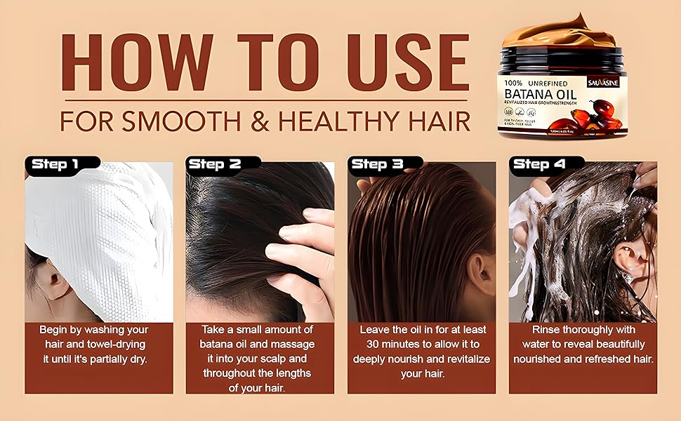 - Easy To Use: Apply a two-finger-width amount to the palm of your hand, apply to hair and scalp, and massage into scalp and roots for 2 to 5 minutes. Cover hair with plastic wrap and wait 20 to 60 minutes. Rinse hair with lukewarm water. If hair is still greasy, rinse with shampoo and add Batana Oil to your hair care program.