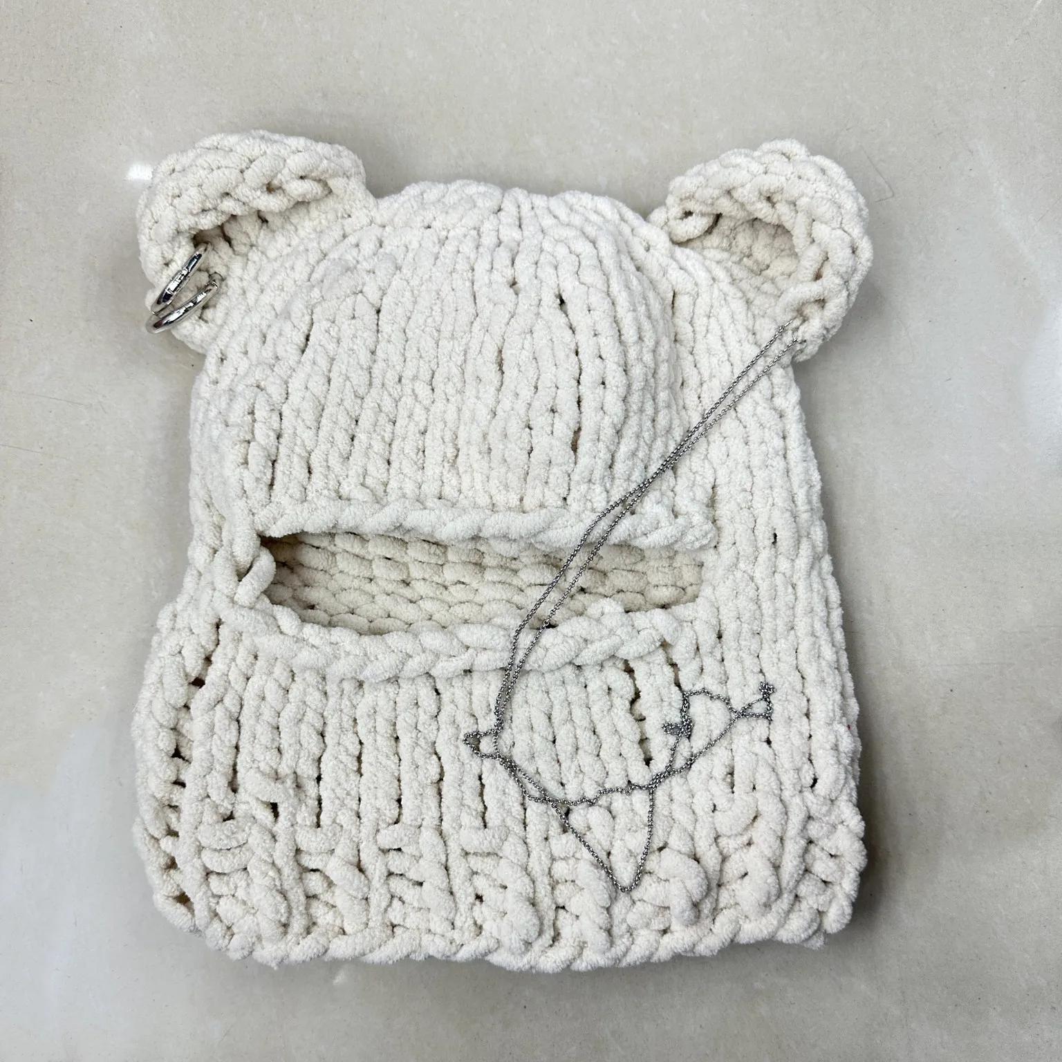 Bear Ears Crochet Balaclava Women Handmade Chain Circle Knitted Hat Party Chenille Mask