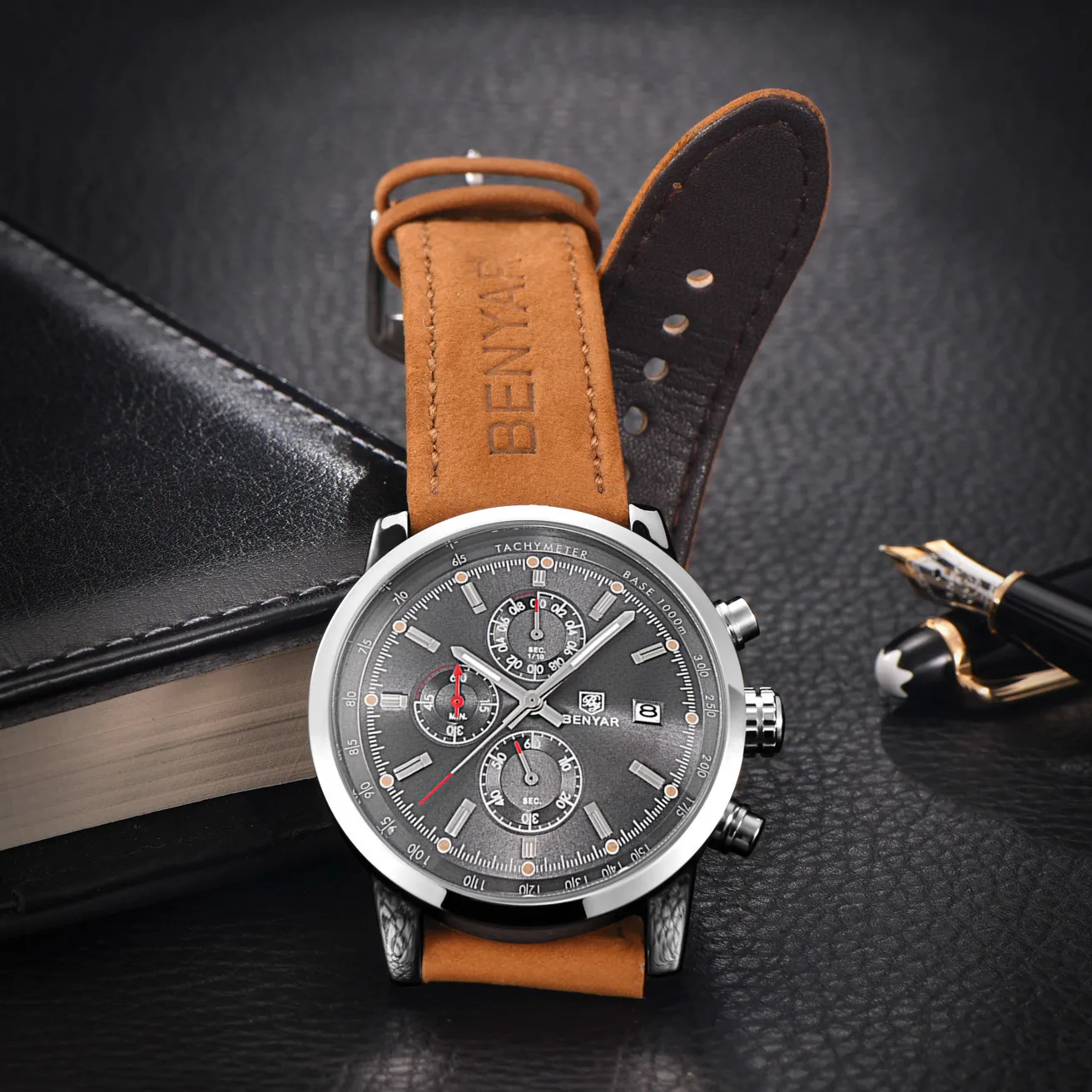 The BENYAR Benya Sports Three Eyed Watch is the perfect blend of style, function, and durability. Whether you're tracking your athletic performance, staying punctual, or adding a bold accessory to your wardrobe, this watch has everything you need. The stylish chronograph design, durable construction, and comfortable leather strap make it a great choice for those looking for a reliable and fashionable watch.