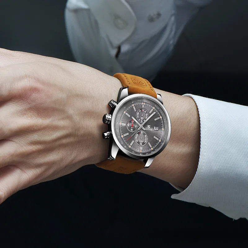 Bold and Stylish Design: The three sub-dials and sleek leather strap create a sporty yet elegant design that complements
