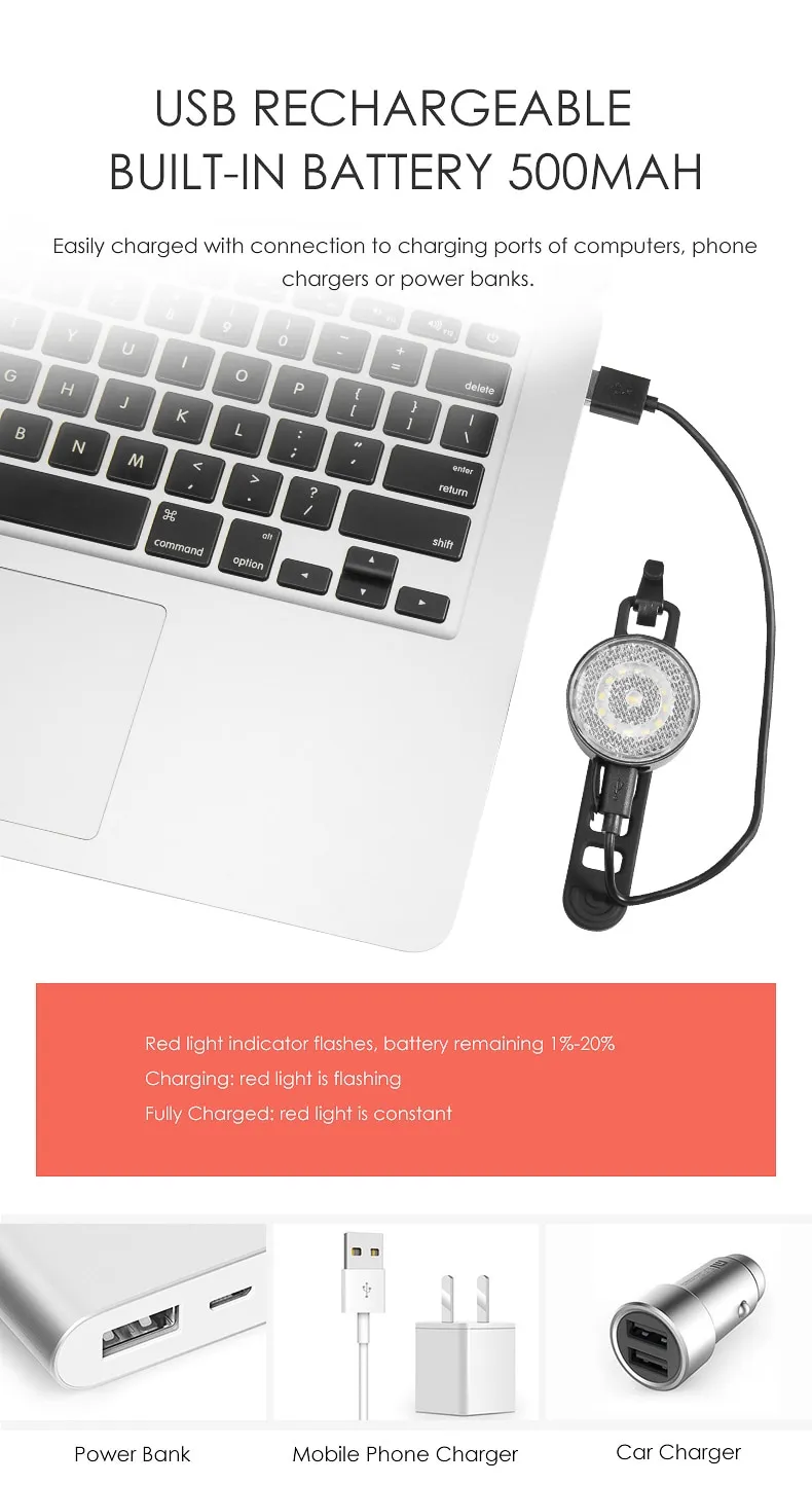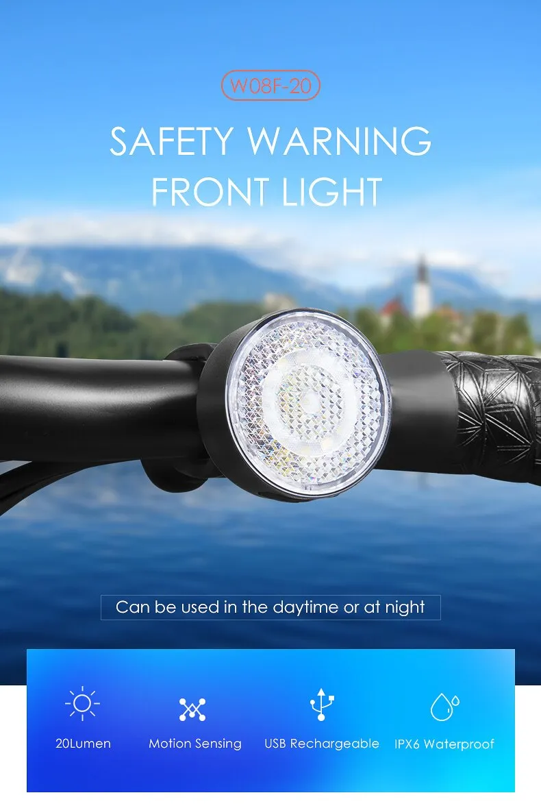 The front light W08 has 5 switchable modes, high brightness 20lumen. Unique daytime warning mode makes your bike safer during the day.