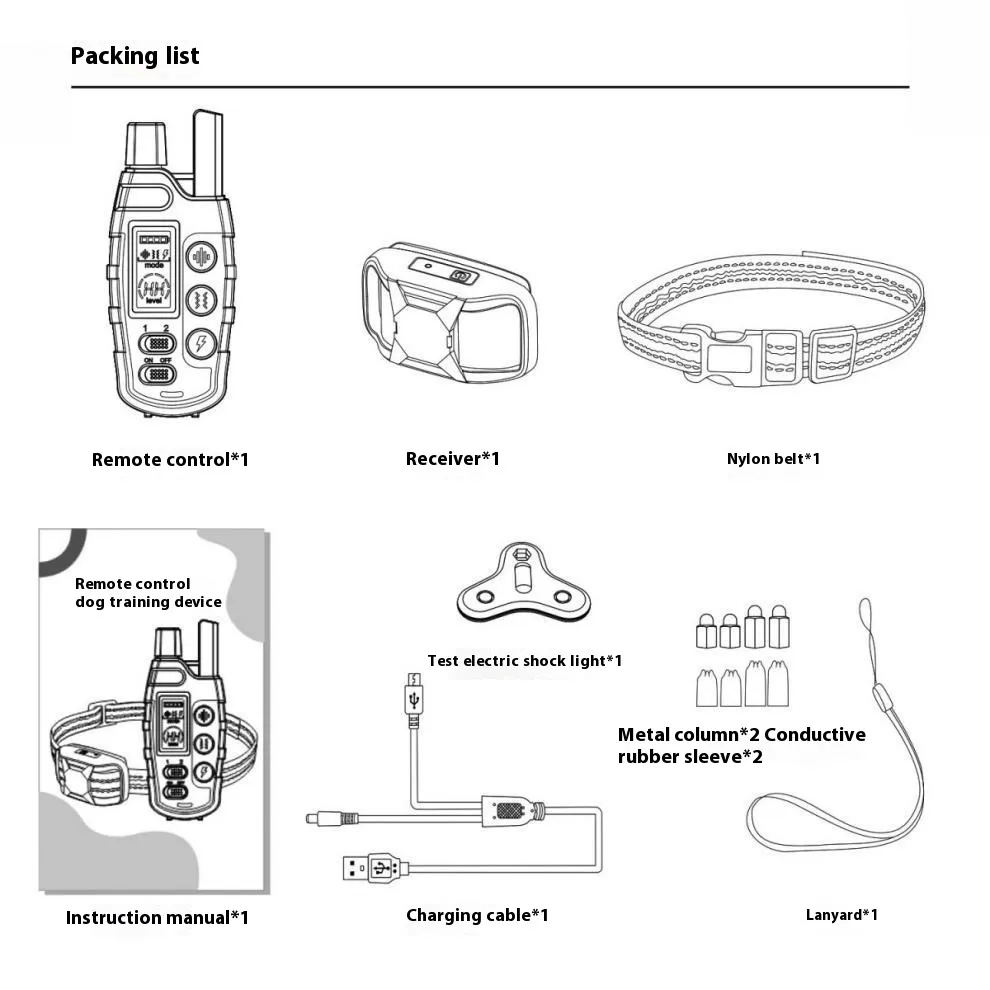 Remote control * 1+receiver * 1+nylon strap * 1+test electric shock lamp * 1+metal pillar * 2+conductive rubber cover * 2+charging cable *