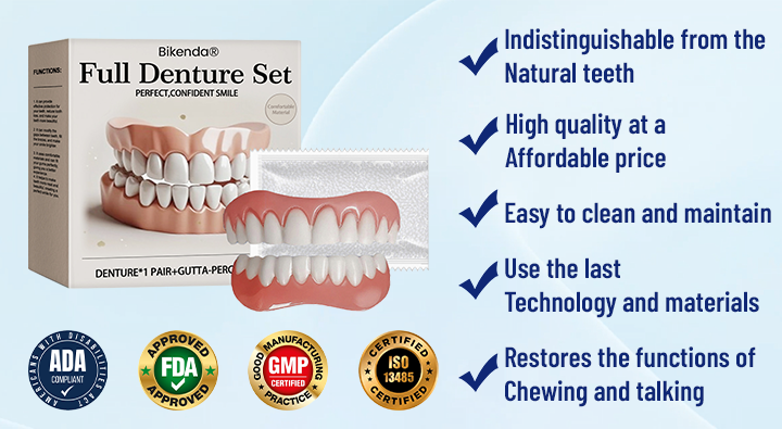Regain your confidence and enjoy the benefits of a complete smile with the Bikenda® Advanced Full Denture Set — your trusted partner in