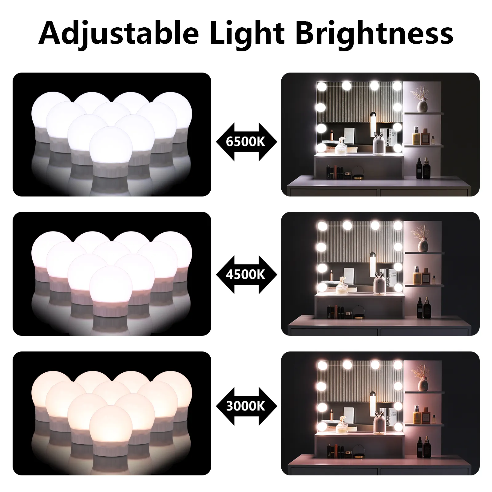 1. Gorgeous Hollywood style illuminated mirror: 10 LED bulbs on the mirror will illuminate evenly from all directions, helping you create