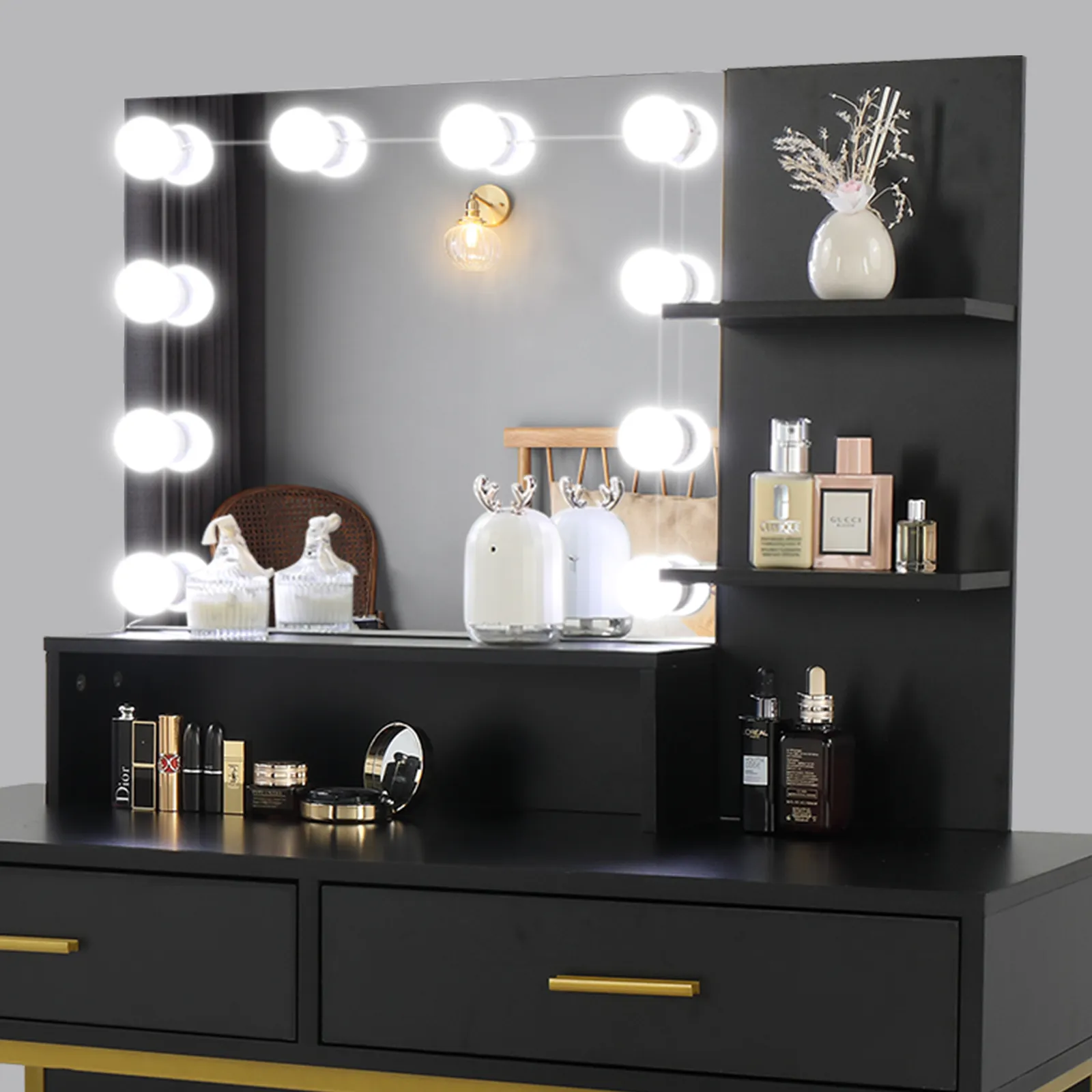 Black Particleboard and Steel Frame Two-Drawer Three-Tier Shelf Dressing Table Set – Light Luxury with Three-Tone Light Design