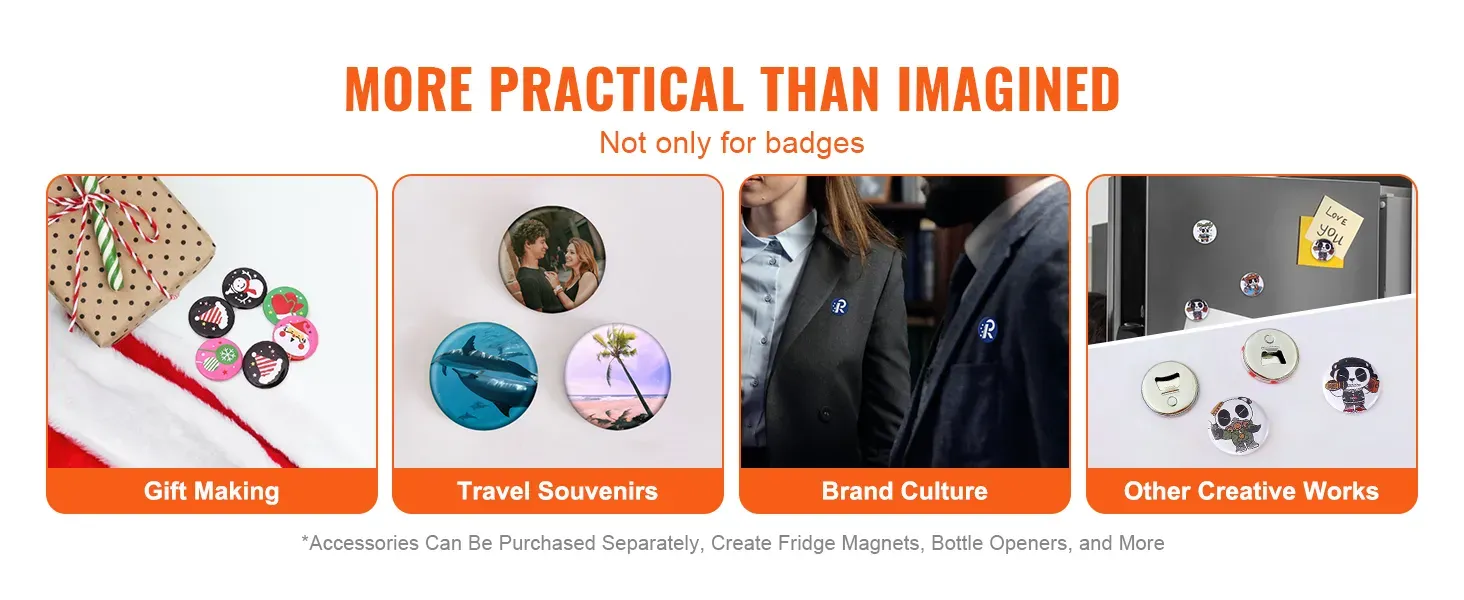 - Meaningful and Versatile Gifts: Want to express your feelings when a special occasion comes up? Want to capture lasting memories in a visual form? Handmade badges are an excellent choice. Our button press maker can also be used to create small gifts such as mirrors, keychains, bottle openers, fridge magnets, and pin buttons.