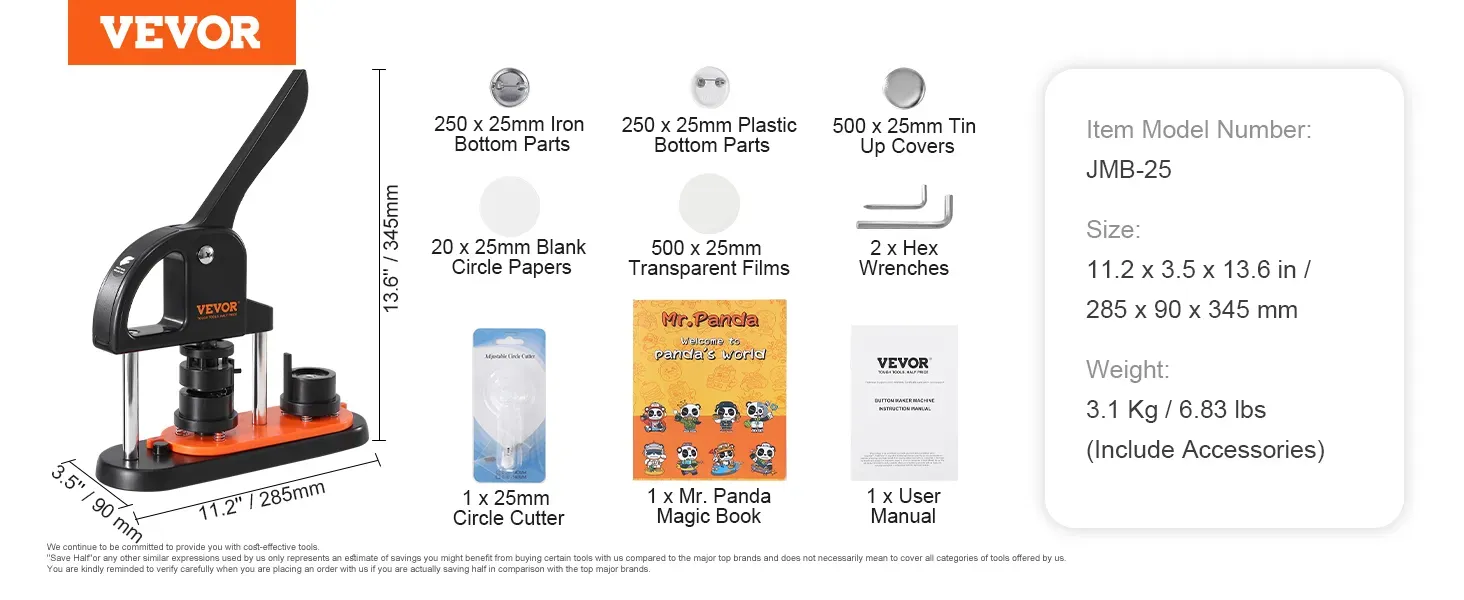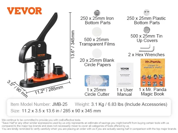 - All-Inclusive Accessory Set: Everything you need for badge-making is here! Our pin maker machine includes 250 each of 0.98”/25mm iron and plastic bottom badges upgraded two material options for more DIY choices), 500 tin up covers, 20 blank circle papers, 500 transparent films, 1 circle cutter, 2 hex wrenches, and 1 user manual. All 0.98”/25mm)
