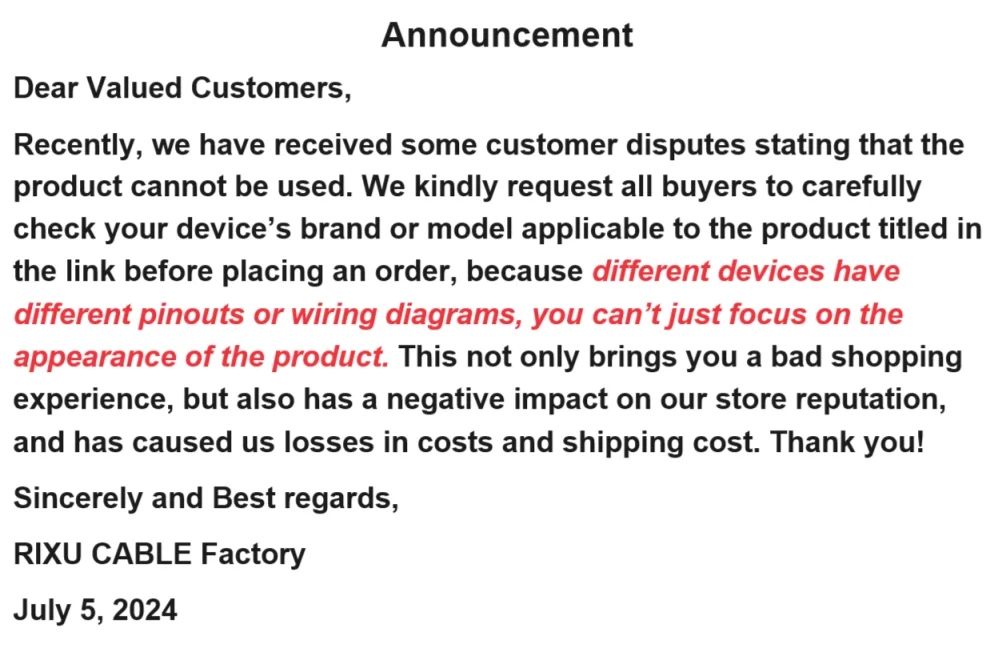 If you have special requirements, such as cable length, wire gauges and pinouts, please consult to me online or leave me a message.