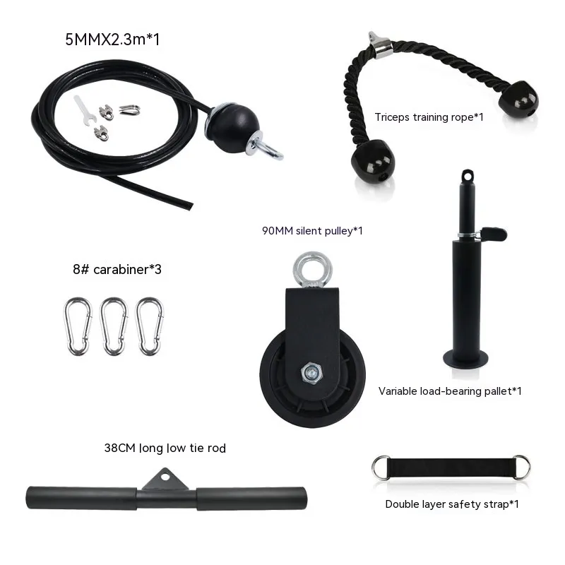 Triceps training rope * 1 Variable load tray * 1 Double layer safety strap * 1 38CM long low pull rod * 1 90MM silent pulley * 1 8 # Mountaineering buckle * 3 5mm x 2.3 meters * 1