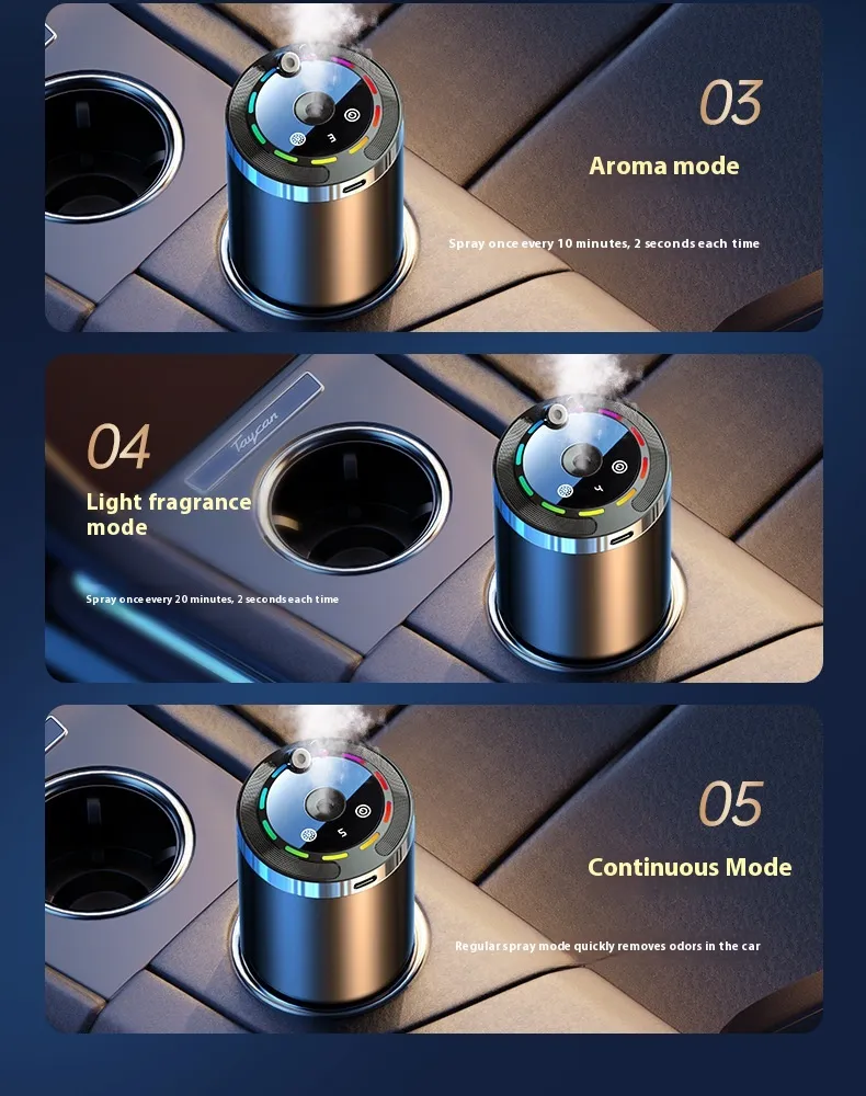 The Car Intelligent Aromatic Diffuser features a smart control system that adjusts the mist intensity and fragrance