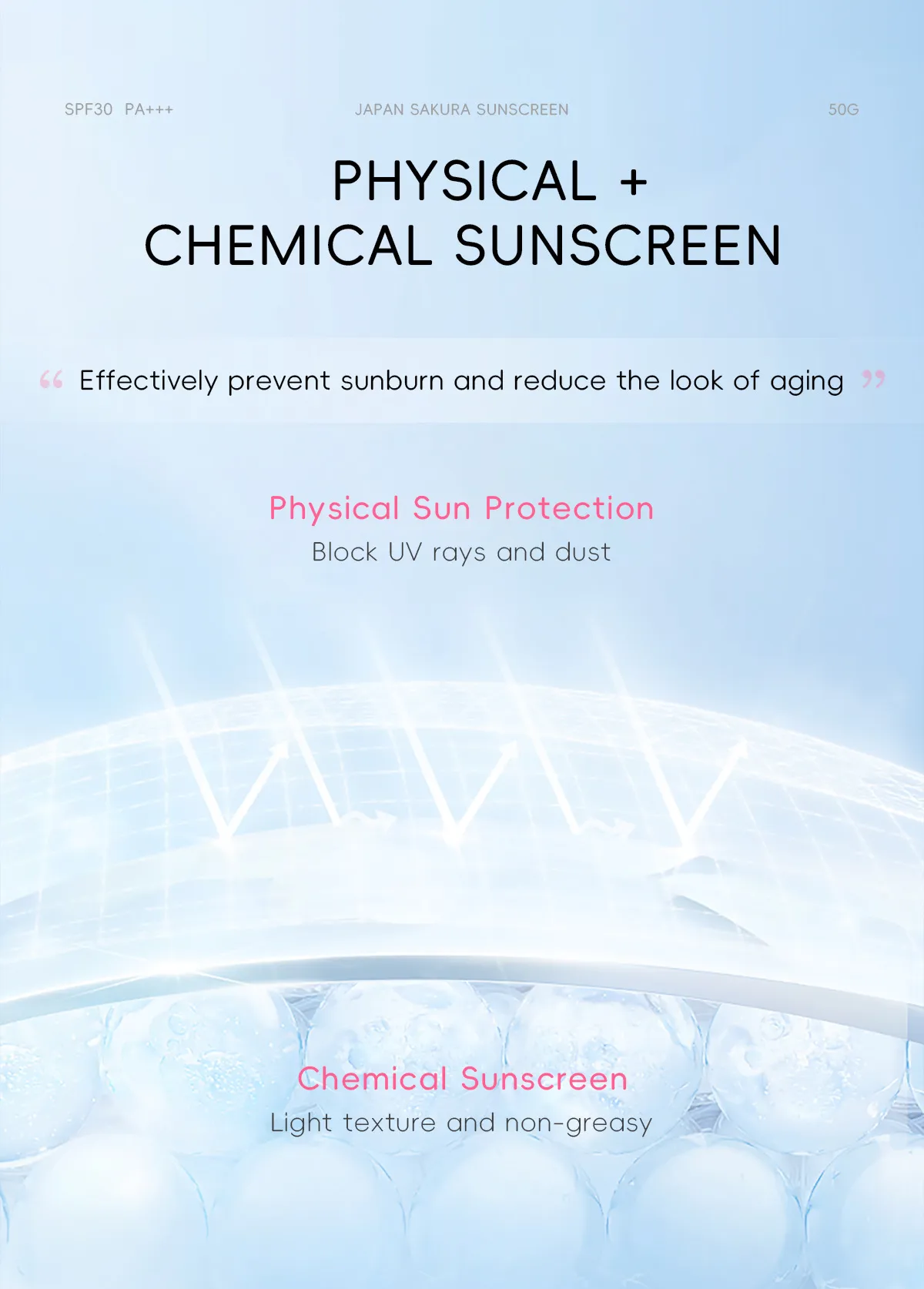 Introducing Cherry Blossom Sunscreen SPF30 Isolation Skin Care Products — a luxurious sunscreen designed to protect your skin from harmful UV rays while providing nourishing skincare benefits. Infused with the delicate essence of cherry blossom, this sunscreen not only shields your skin from sun damage but also helps to soothe, hydrate, and brighten your complexion. With SPF30 protection, this product offers broad-spectrum defense against both UVA and UVB rays, ensuring your skin remains safe, healthy, and radiant all day long.