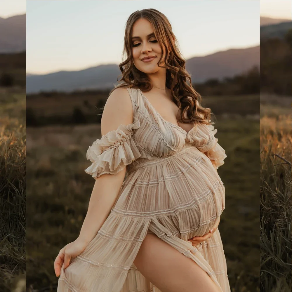 Chiffon Pregnant Women Photography Dresses Elegant Pleated V-neck Short Sleeved Dress Maternity Dresses For Baby Showers
