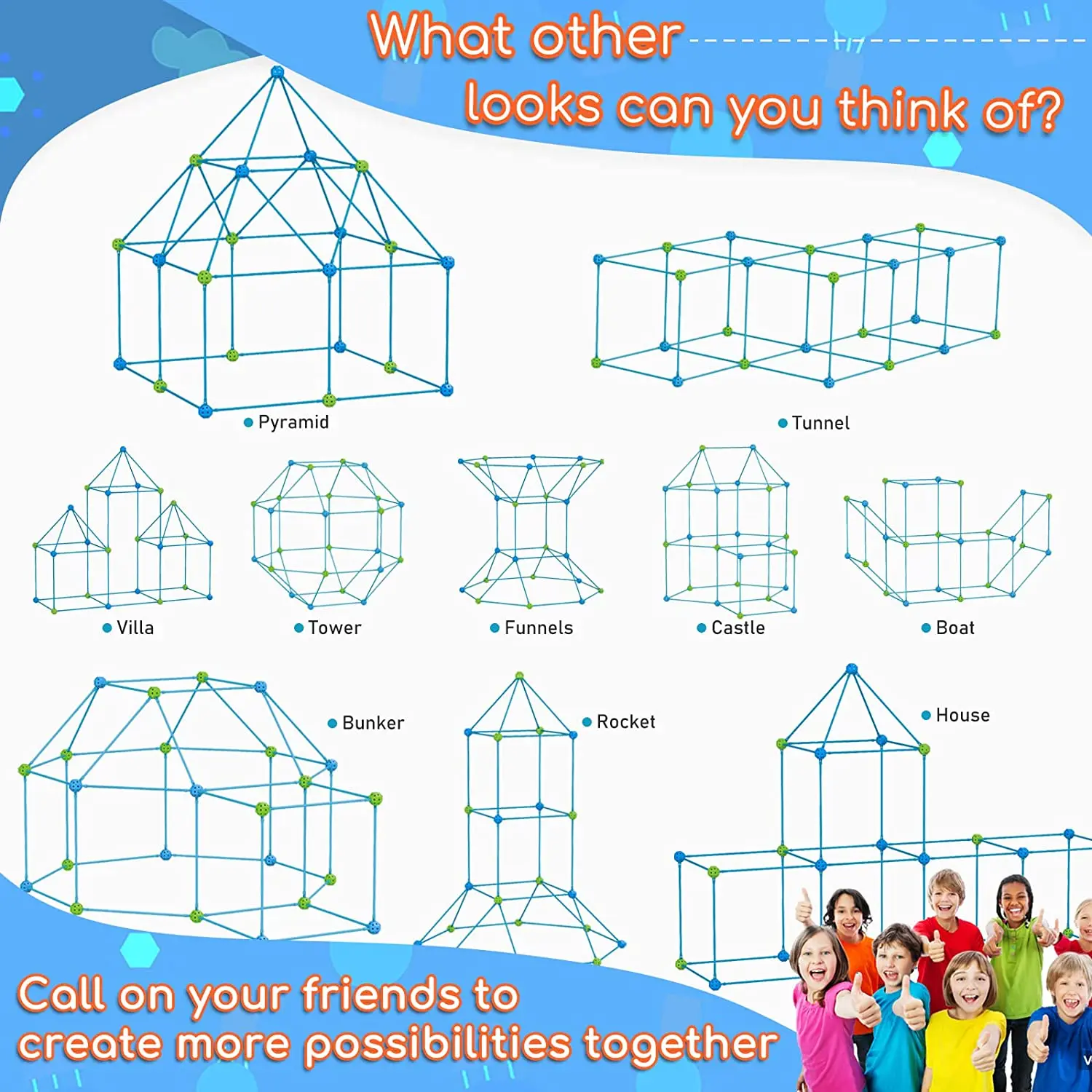 1.【DIY Fortress Building Kits】: 120pcs creative kids fortress kits, enough quantity to assemble adult height fortresses. Includes 75 (17") long fort tube (including interface), 45 (1.9") 26-sided multicolor cube ball with tubes and balls, you can build a variety of shapes and forts.