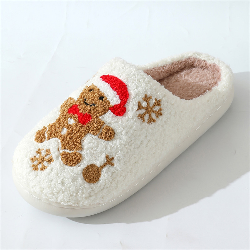 Embodying the spirit of the holidays, these slippers feature charming gingerbread man motifs adorned with delicate snowflake patterns. The festive design not only adds a touch of holiday cheer to your loungewear but also makes these slippers a delightful accessory for the season.