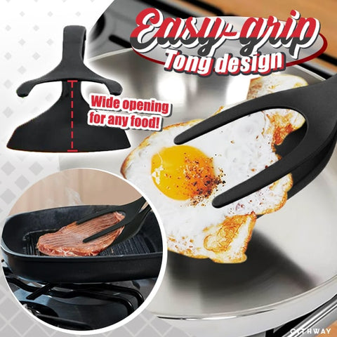 A unique spatula tool that is expertly-crafted in a tong-like design to deliver an easier and better food gripping, flipping,