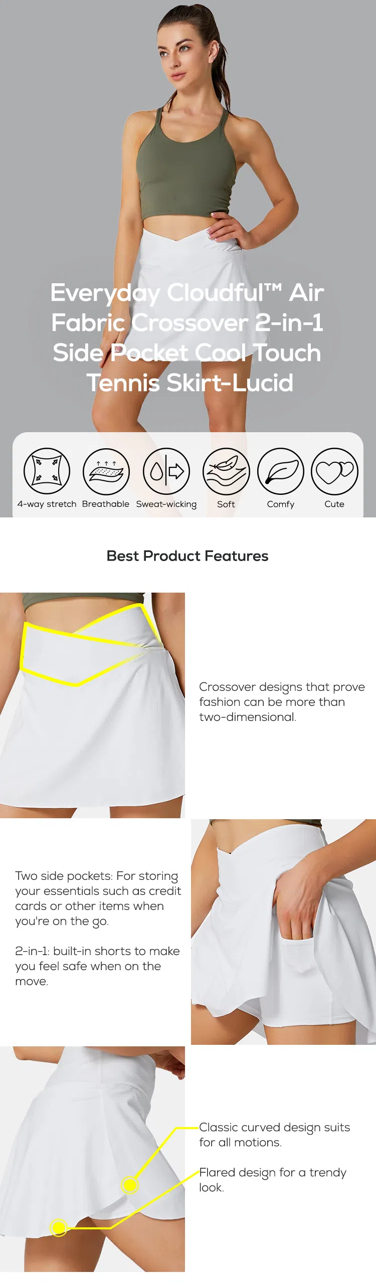 - 2-in-1: Built-in shorts for comfort & coverage, to keep you confident for movement.