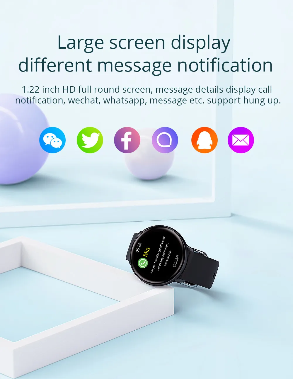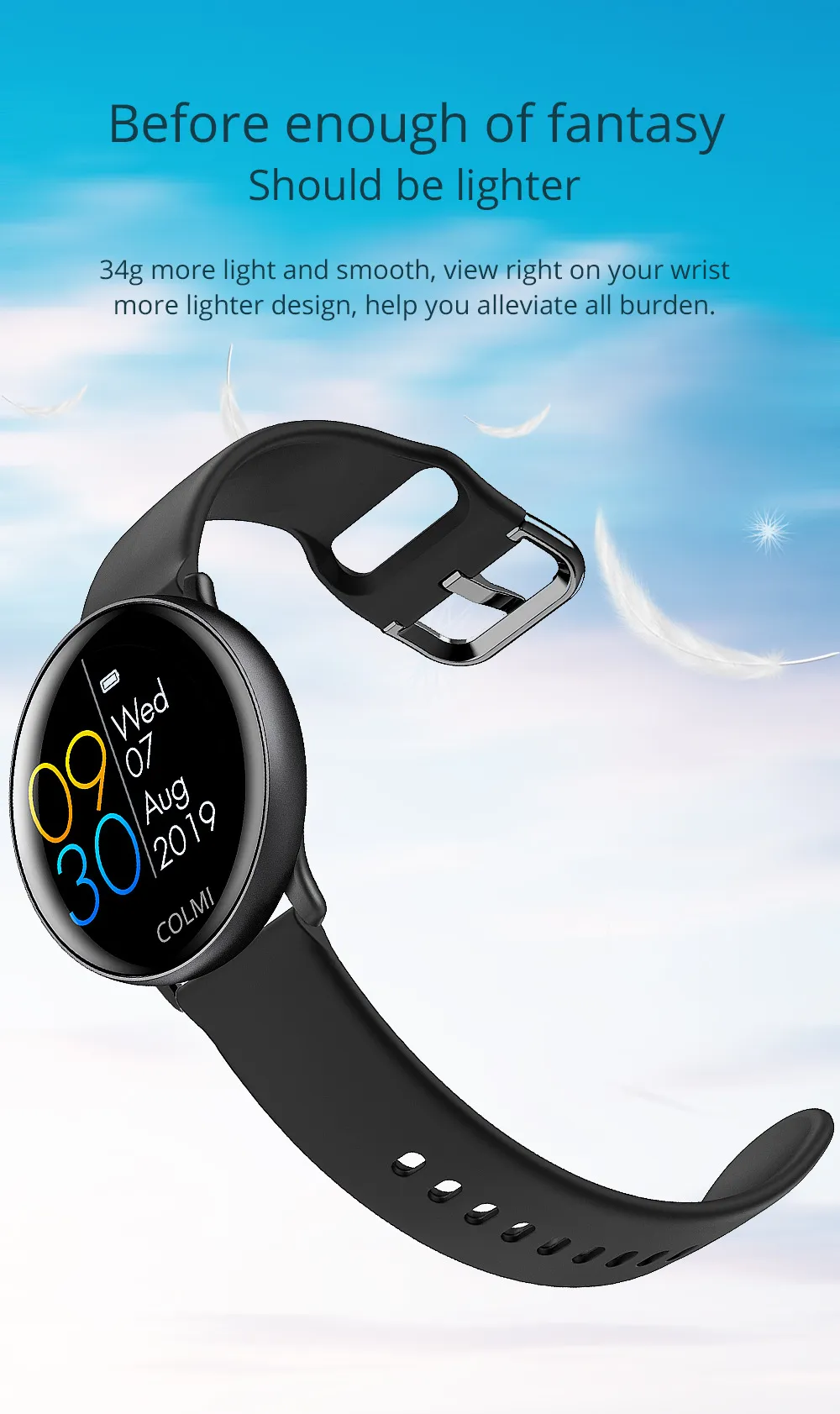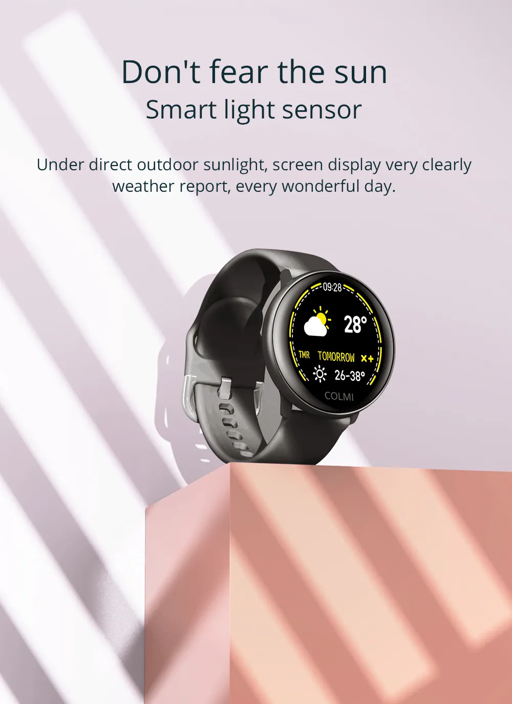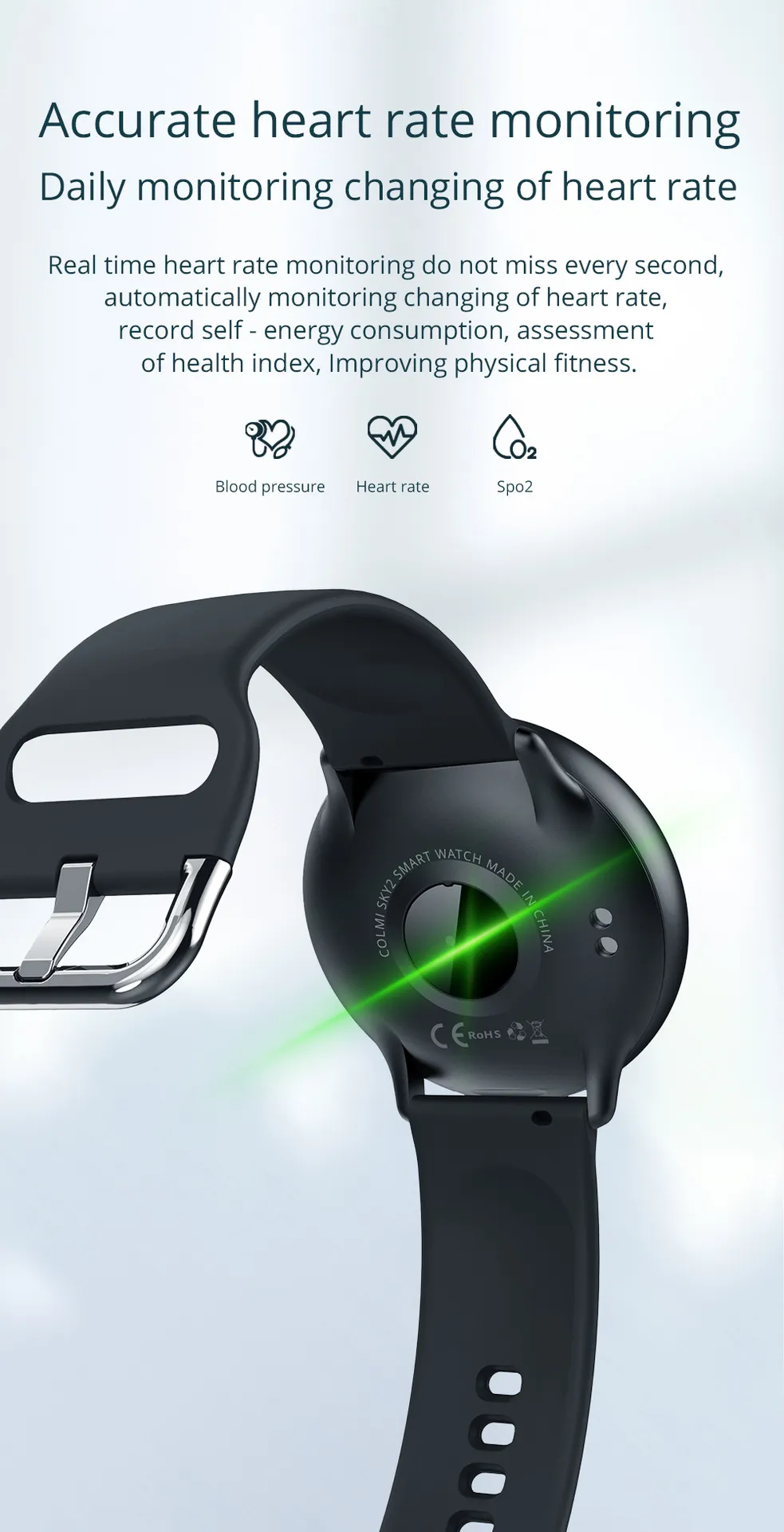 The COLMI SKY2 boasts a modern, lightweight design, weighing just 35.9g. Its 1.22-inch full-touch 2.5D curved display provides vibrant visuals, ensuring clarity under various lighting conditions. The watch's round dial and silicone strap offer comfort and style, making it suitable for both casual and formal settings.
